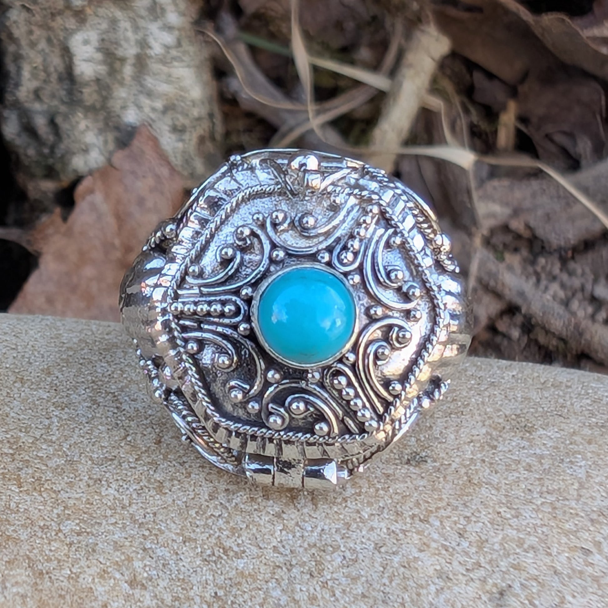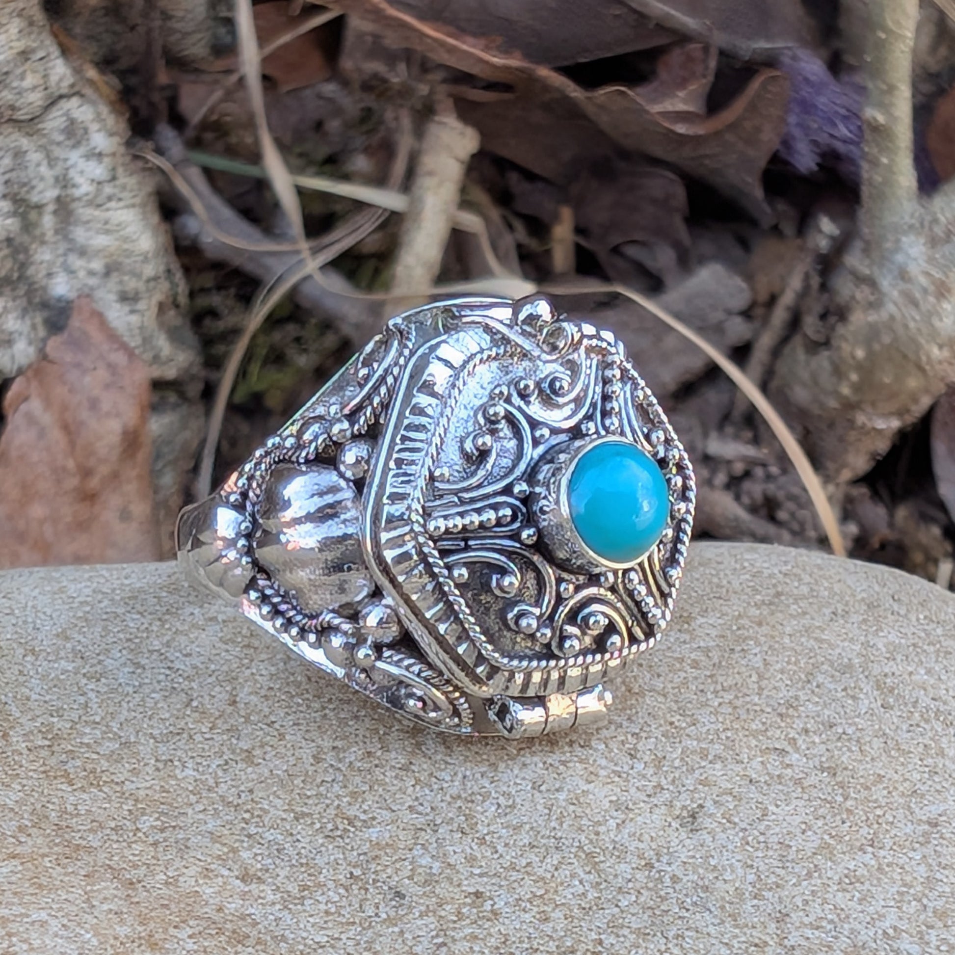 This poison ring is set with a genuine piece of Arizona Turquoise and is crafted of solid sterling silver. It opens to reveal a secret compartment that could hold small pills, a prayer, or other small important keepsakes. Crafted of sterling silver and marked 925.