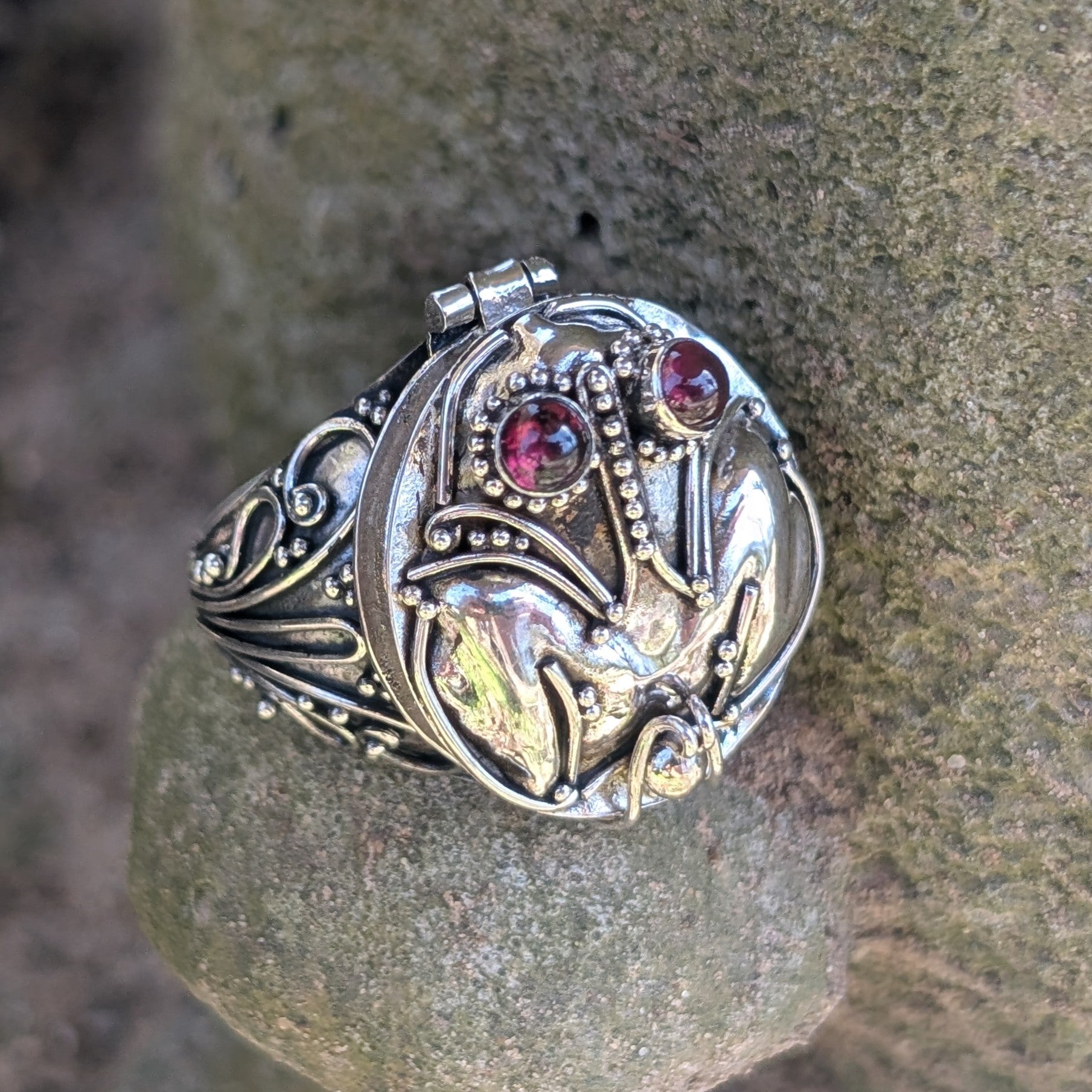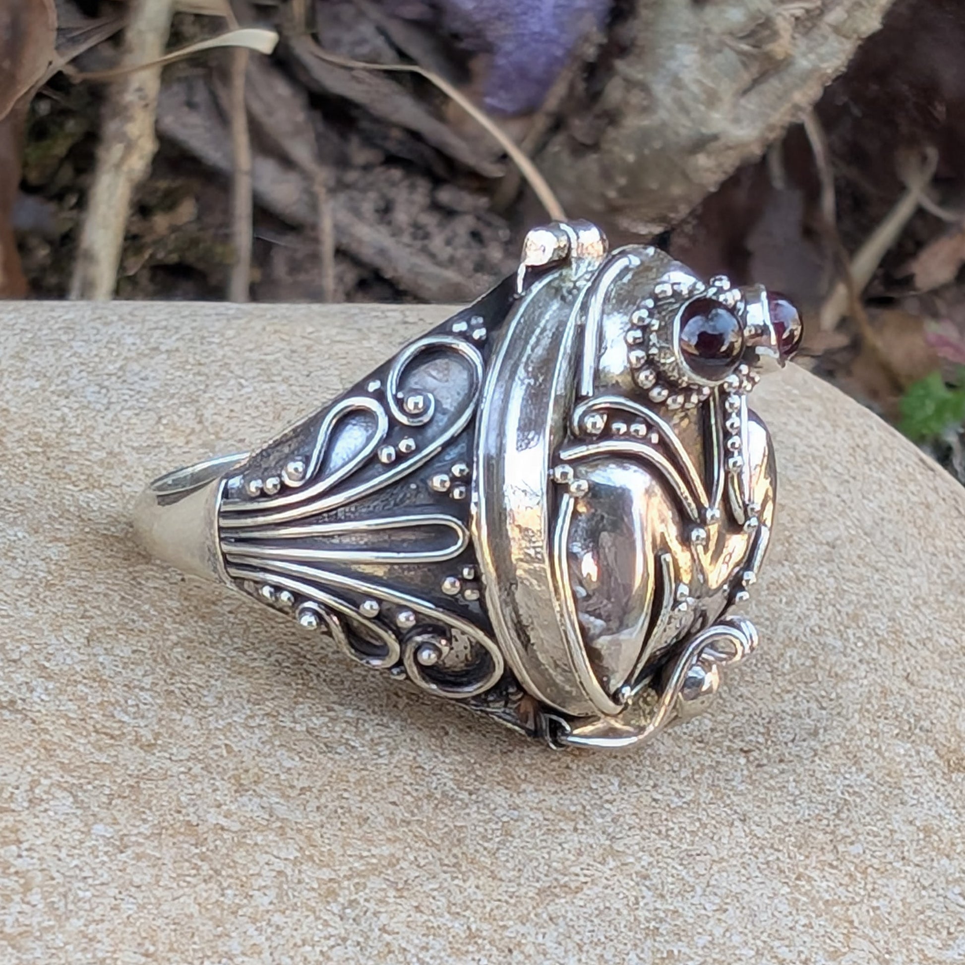 This poison ring is set with small genuine garnets and is crafted of solid sterling silver. It opens to reveal a secret compartment that could hold small pills, a prayer, or other small important keepsakes. Crafted of sterling silver and marked 925.